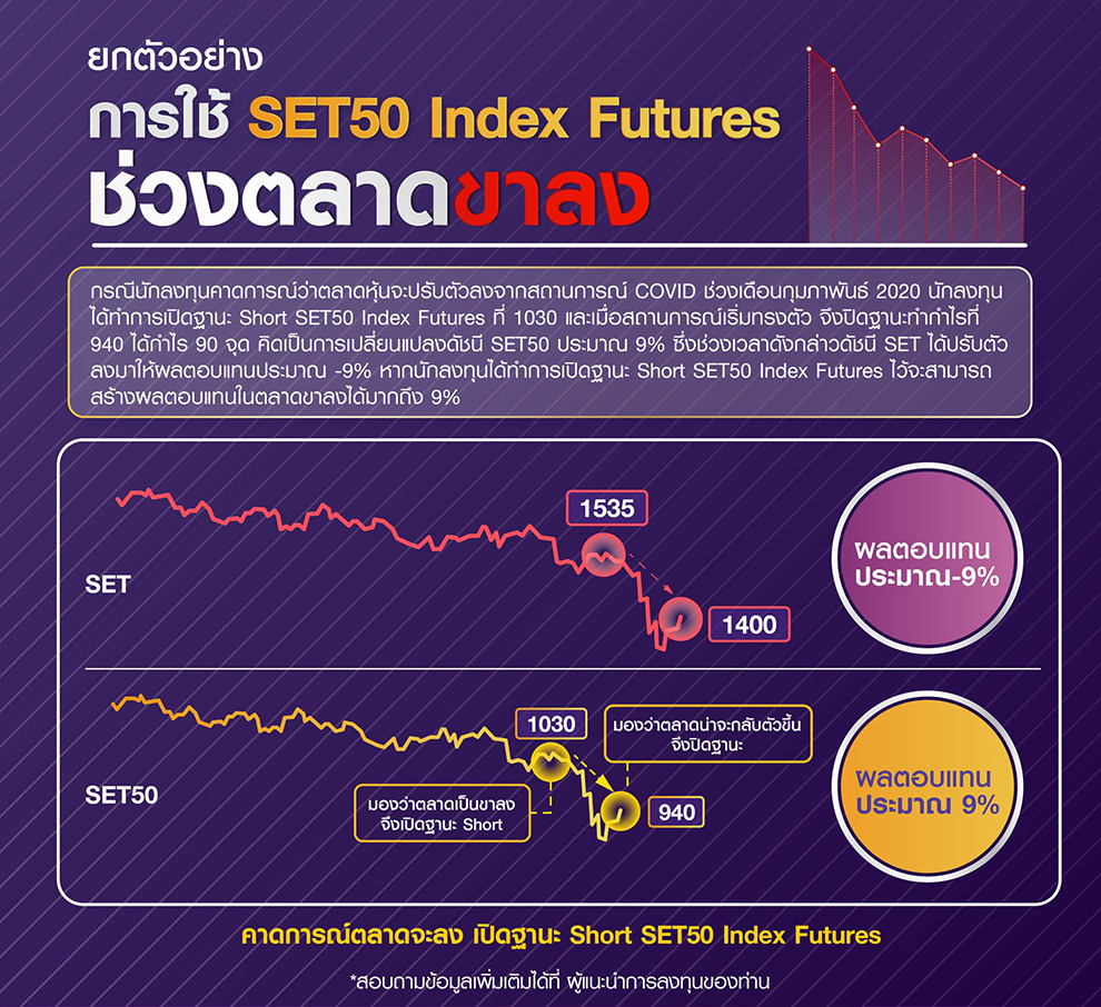 กรณีนักลงทุนคาดการณ์ว่าตลาดหุ้นจะปรับตัวลงจากสถานการณ์ COVID ช่วงเดือนกุมภาพันธ์ 2020 นักลงทุนได้ทำการเปิดฐานะ Short SET50 Index Futures ที่ 1030 และเมื่อสถานการณ์เริ่มทรงตัว จึงปิดฐานะทำกำไรที่ 940 ได้กำไร 90 จุด คิดเป็นการเปลี่ยนแปลงดัชนี SET50 ประมาณ 9% ซึ่งช่วงเวลาดังกล่าวดัชนี SET ได้ปรับตัวลงมาให้ผลตอบแทนประมาณ -9% หากนักลงทุนได้ทำการเปิดฐานะ Short SET50 Index Futures ไว้จะสามารถสร้างผลตอบแทนในตลาดขาลงได้มากถึง 9%
