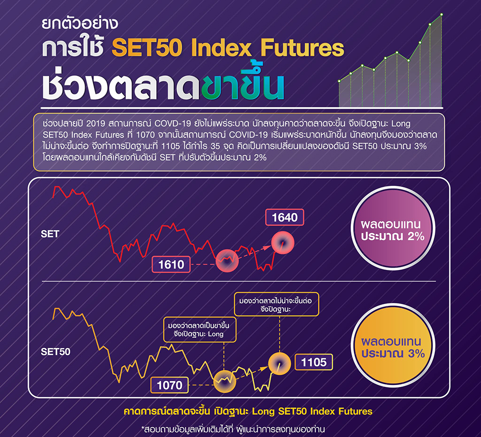 ช่วงปลายปี 2019 สถานการณ์ COVD-19 ยังไม่แพร่ระบาด นักลงทุนคาดว่าตลาดจะขึ้น จึงเปิดฐานะ Long SET50 Index Futures ที่ 1070 จากนั้นสถานการณ์ COVID-19 เริ่มแพร่ระบาดหนักขึ้น นักลงทุนจึงมองว่าตลาดไม่น่าจะขึ้นต่อ จึงทำการปิดฐานะที่ 1105 ได้กำไร 35 จุด คิดเป็นการเปลี่ยนแปลงของดัชนี SET50 ประมาณ 3% โดยผลตอบแทนใกล้เคียงกับดัชนี SET ที่ปรับตัวขึ้นประมาณ 2%