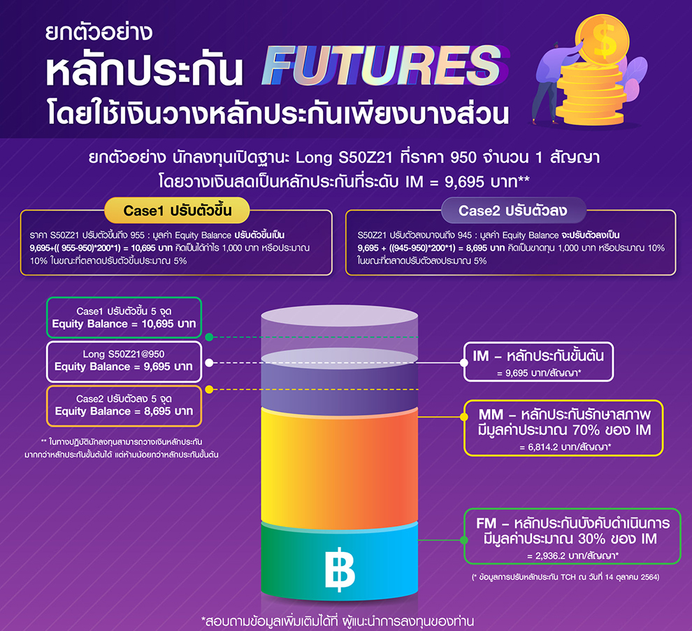 การเปิดฐานะใน Futures ไม่จำเป็นต้องใช้เงินเต็มมูลค่าสัญญาในการซื้อขาย โดยสามารถวางเงินหลักประกันขั้นต้นประมาณ 10-15% ของมูลค่าสัญญาก่อนการซื้อขาย หรือที่เรียกกันว่าการ “Leverage” เช่น หากนักลงทุนเปิดสัญญาของ S50H21 ที่ราคา 950 (มูลค่าสัญญา = 950*200 (Multiplier) = 190,000 บาท) โดยวางเงินสดเป็นหลักประกันเพียง 15,000 บาท ก็สามารถเปิดฐานะได้ ในทางปฏิบัติ ควรวางหลักประกันให้เหมาะสม ให้สอดคล้องกับกลยุทธ์ และภาวะตลาด
