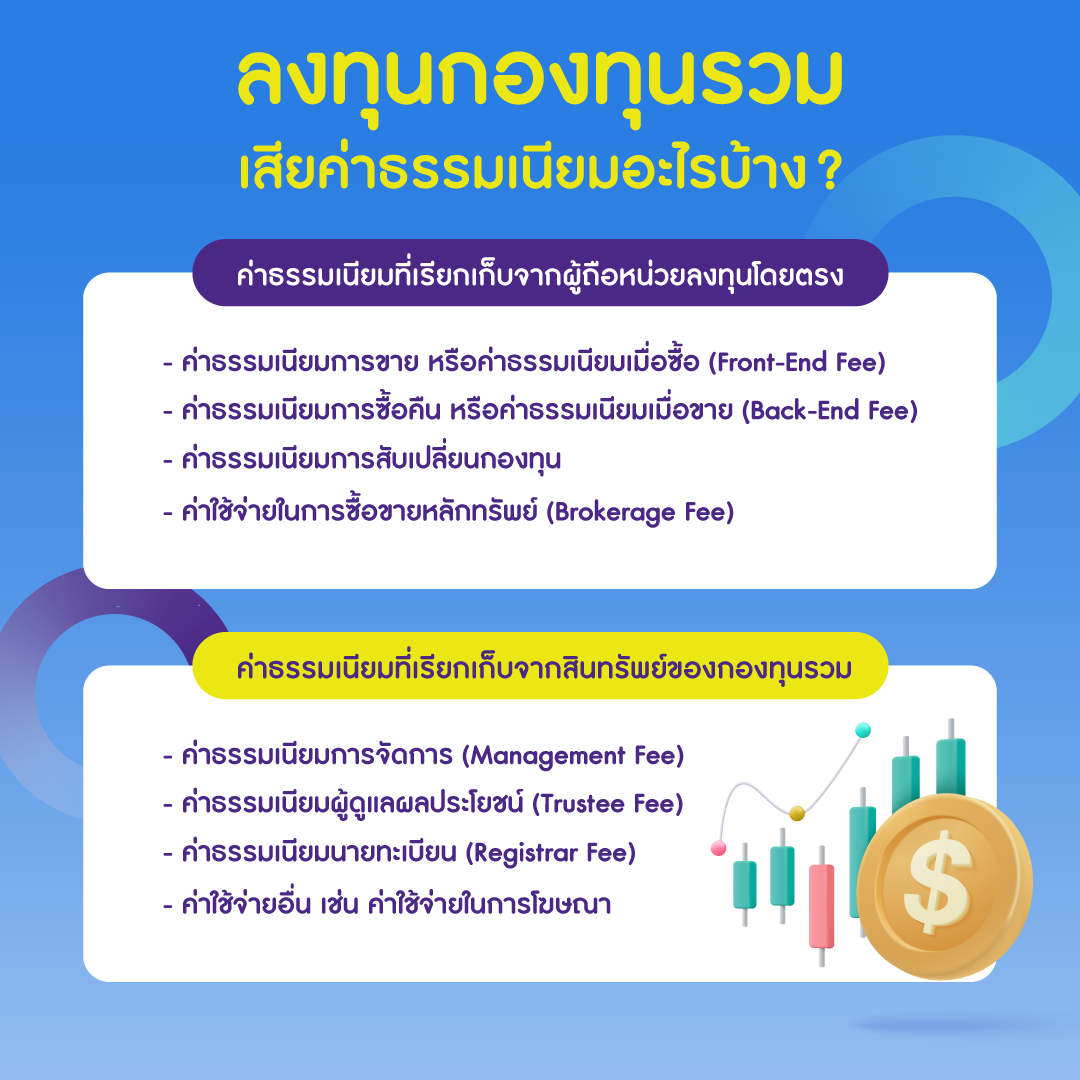 - ค่าธรรมเนียมการขาย เรียกอีกอย่างหนึ่งว่าค่าธรรมเนียมเมื่อซื้อ (Front-End Fee) คือ ค่าธรรมเนียมที่เก็บเมื่อกองทุนขายหน่วยลงทุนให้กับเรา หรือเมื่อเราซื้อกองทุน