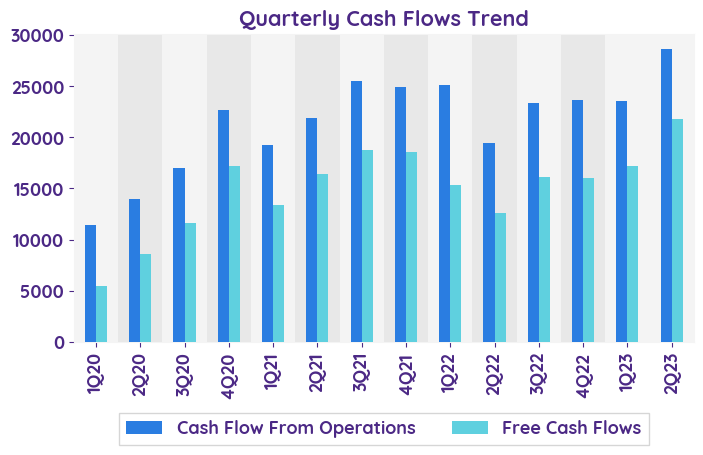 Alphabet showcased strong financials as of September 30, 2023, with total assets at $396,711 million and current assets at $119,935 million. Operating activities generated $30,656 million in net cash, contributing to a positive free cash flow of $22,601 million, despite significant investments in property and equipment. However, financing activities led to a net cash outflow of $18,382 million. Overall, the company maintained a robust balance sheet and demonstrated impressive cash generation capabilities.