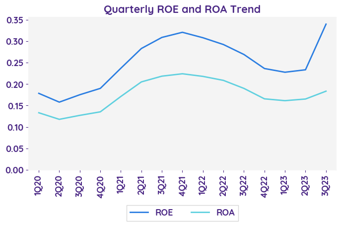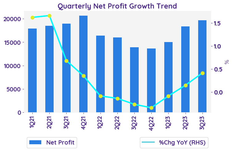 The net profit for the quarter ended March 31, 2023, decreased compared to the same quarter in the previous year. The net profit declined from $16,436 million to $15,051 million. This represents a quarter-over-quarter (QoQ) decrease of approximately 8.4%.