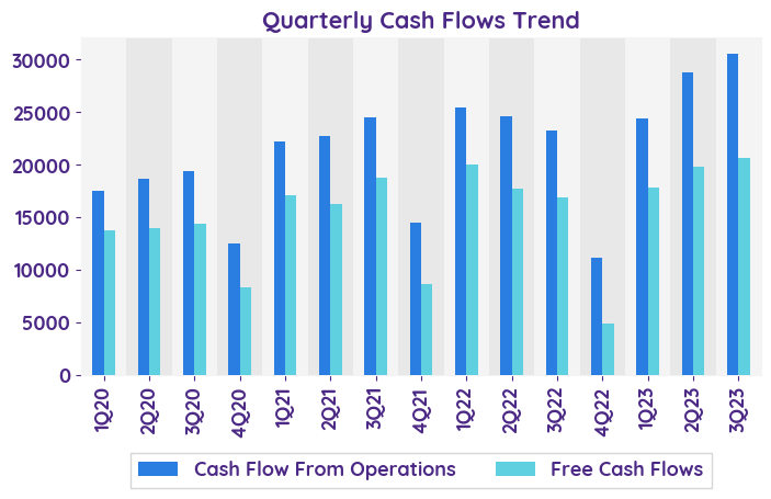 Revenue exceeded estimates and remained robust in the fiscal first quarter, ending September 30, with a 13% increase to $56.5 billion, surpassing the average projections of analysts. The company delivered growth across all business segments as detailed below: - Productivity and Business Processes: Revenue increased from $16,465 million in 2022 to $18,592 million in 2023, representing a growth of 13%. - Intelligent Cloud: Revenue increased from $20,325 million in 2022 to $24,259 million in 2023, representing a growth of 19%. - More Personal Computing: Revenue increased from $13,332 million in 2022 to $13,666 million in 2023, representing a growth of 3%.