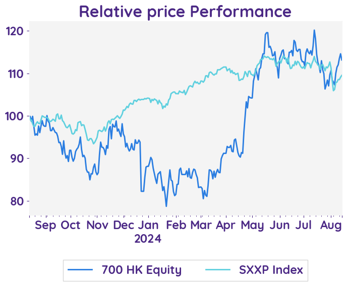 Tencent Holdings Limited is a holding company. The Company provides services including social network, music, gateway websites, e-commerce, mobile gaming, payment system, entertainment, artificial intelligence and technology solutions through its subsidiaries. Tencent Holdings serves customers worldwide.