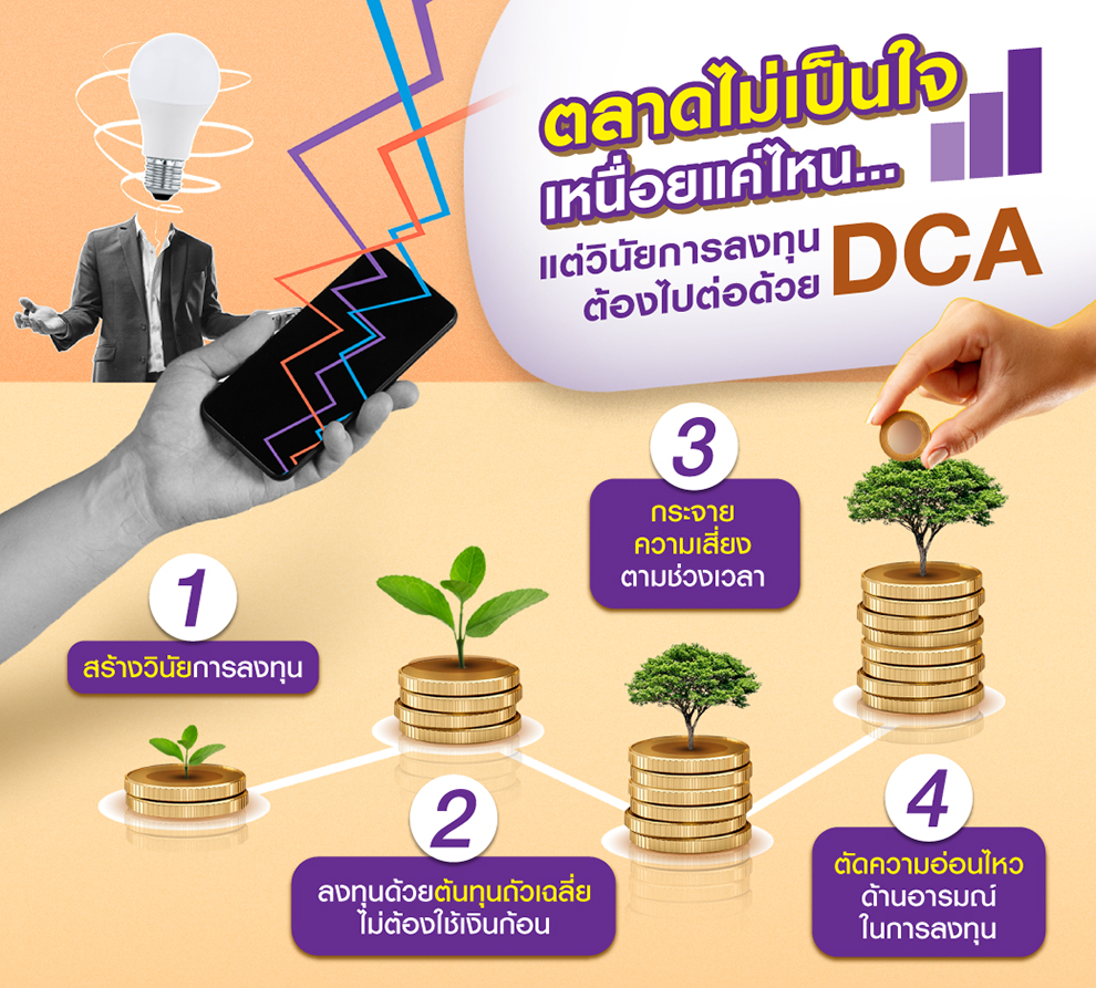การลงทุนแบบ DCA (Dollar-Cost Averaging) หรือ การถัวเฉลี่ยต้นทุน เป็นวิธีการลงทุนแบบถัวเฉลี่ยต้นทุนอย่างสม่ำเสมอเป็นจำนวนเงินเท่า ๆ กัน ซึ่งวิธีนี้เป็นอีก how to คลาสสิกของนักลงทุนที่มีข้อดี ไม่ว่าจะเป็นในช่วงภาวะตลาดดีหรือแย่ก็ตาม