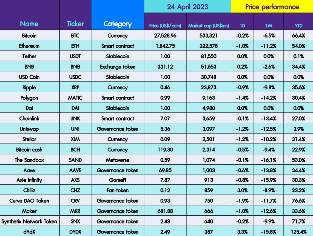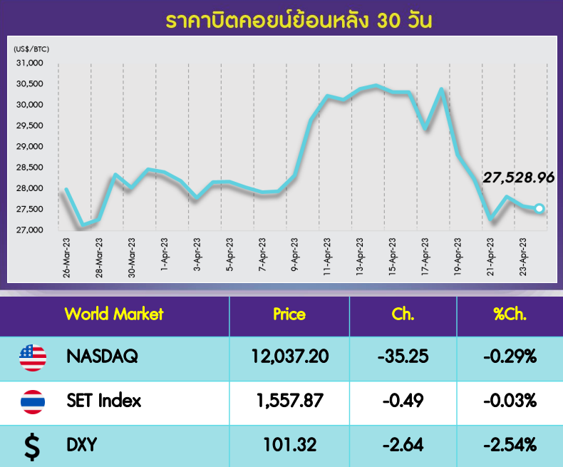 ตลาด Cryptocurrency ในช่วง 1 วันที่ผ่านมาเป็นการแกว่งตัวในกรอบแคบ โดยราคา Bitcoin (BTC) ปรับตัวลดลง 0.2% อยู่ที่ US$27,529 และ Ethereum (ETH) ปรับตัวลดลง 1% อยู่ที่ US$1,843 โดยนักลงทุนยังคงอยู่ในสถานะ Wait and see เพื่อรอดูท่าที่ของการประชุม Fed ในสัปดาห์หน้ารวมถึงผลประกอบการหุ้นกลุ่ม Regional banks ของประเทศสหรัฐที่จะทยอยรายงานในสัปดาห์นี้โดยสิ่งที่ต้องติดตามคือตัวเลขเงินฝากว่ายังมีทิศทางลดลงต่อเนื่องหรือไม่ ซึ่งประเด็นของกลุ่มธนาคารเคยเป็นหนึ่งในปัจจัยที่ผลักดันราคา Cryptocurrency ก่อนหน้านี้โดยเฉพาะ BTC Crypto Greed & Fear index ทรงตัวอยู่ที่ 53 สอดคล้องกับภาพรวมราคาที่แกว่งตัวในกรอบแคบ โดยยังอยู่ในระดับ Neutral |