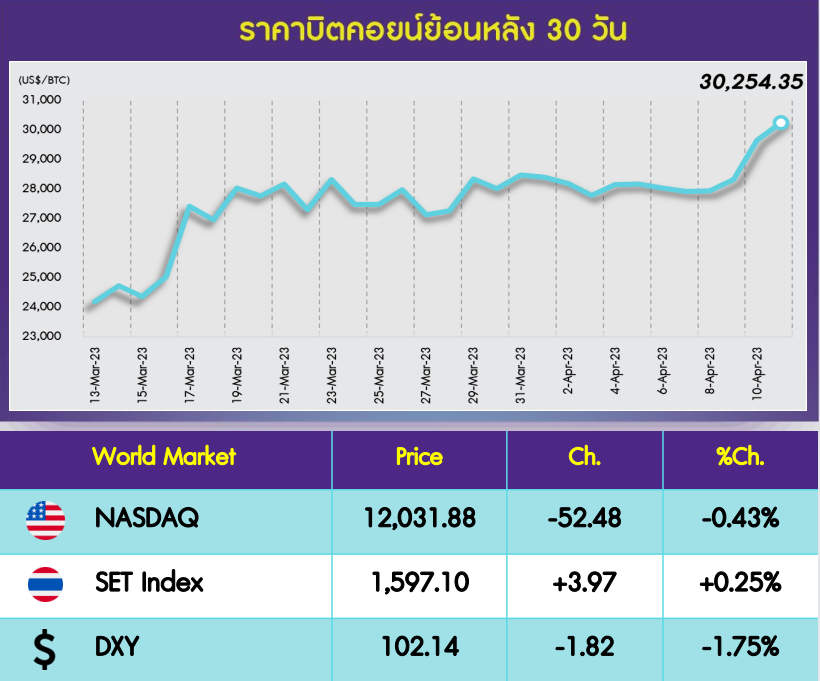 ตลาด Cryptocurrency ในช่วง 1 วันที่ผ่านมาเป็นการปรับตัวแบบผสมผสาน โดยราคา Bitcoin (BTC) ปรับตัวเพิ่มขึ้น 2% อยู่ที่ US$30,254 BTC ถือว่าเป็นการสร้างจุดสูงสุดใหม่ของปีอีกครั้งและเป็นการทะลุแนวต้านทางเทคนิคที่สำคัญในที่ US$30,000 ทำให้เกิดแรงเก็งกำไรเพิ่มเติมขึ้นมา ราคา Ethereum (ETH) ปรับตัวลดลง 1% อยู่ที่ US$1,893 สวนทางกับราคา BTC ภายหลังจากที่เข้าใกล้ช่วง Shanghai upgrade ทำให้นักลงทุนทยอยลดความเสี่ยงเพื่อรอดูแรงขายจากผู้ที่เตรียมจะถอนเหรียญที่เคยฝากไว้ออกมา วันนี้เองนักลงทุนต้องติดตามตัวเลข Core CPI ของประเทศสหรัฐ Crypto Greed & Fear index ปรับตัวลดลงเล็กน้อยอยู่ที่ 65 จาก 68 โดยยังคงอยู่ในระดับ Greed |