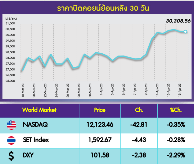 ตลาด Cryptocurrency ในช่วงวันหยุดยาวที่ผ่านมาปรับตัวเพิ่มขึ้นได้อย่างต่อเนื่อง โดยราคา Bitcoin (BTC) ปรับตัวเพิ่มขึ้น 0.2% อยู่ที่ US$30,309 โดยเป็นการสร้างจุดสูงสุดใหม่ของปีอีกครั้ง และ Ethereum (ETH) ปรับตัวเพิ่มขึ้น 11.9% อยู่ที่ US$2,119 เป็นการสร้างจุดสูงสุดใหม่เช่นกัน โดย ETH ปรับตัวขึ้นโดดเด่นกว่า BTC ภายหลังจากที่ Shanghai upgrade ผ่านไปได้ด้วยดีและไม่เห็นการถอน ETH ออกมาขาย โดยปริมาณเหรียญที่มีการ Stake ไว้ทั้งหมดยังใกล้เคียงก่อนการ upgrade ที่ 17.9 ล้านเหรียญ NASDAQ เมื่อวันศุกร์ที่ผ่านมาปรับตัวลดลง  0.4% Crypto Greed & Fear index ปรับตัวเพิ่มขึ้นสอดคล้องกับราคาที่เพิ่มขึ้นอยู่ที่ 69 จาก 65 โดยยังคงอยู่ในระดับ Greed