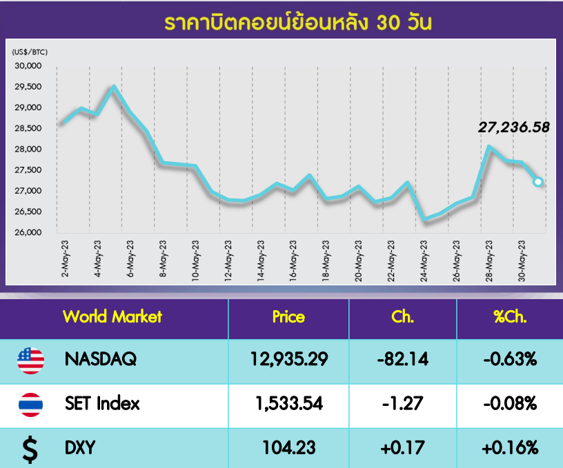 ตลาด Cryptocurrency ในช่วง 1 วันที่ผ่านมาเป็นภาพของการปรับตัวลดลง โดยราคา Bitcoin (BTC) ลดลง 1.7% อยู่ที่ US$27,237 และ Ethereum (ETH) ลดลง 1.3% อยู่ที่ US$1,876 โดยภาพรวมเมื่อคืนที่ผ่านมาภาพรวมการลงทุนได้รับแรงกดดันจาก ตัวเลขการเปิดรับการสมัครงานที่ออกมาสูงกว่าคาดแสดงถึงแนวโน้มเศรษฐกิจที่ยังแข็งแกร่ง ทำให้สิ่งที่ตลาดคาดหวังว่าจะเห็นการลดลงของดอกเบี้ยในเร็วๆนี้อาจจะเกิดขึ้นได้ยาก โดยล่าสุดนักลงทุนคาดหวังว่า Fed มีโอกาสที่จะปรับขึ้นดอกเบี้ยเพิ่มเติมในการประชุมเดือน มิ.ย. ด้วยซ้ำ ดัชดี NASDAQ ปรับลดลง 0.6% Crypto Greed & Fear index เพิ่มขึ้นเล็กน้อยอยู่ที่ 52 จาก 51 สวนทางกับราคาที่ปรับลดลง โดยภาพรวมยังอยู่ในระดับ Neutral