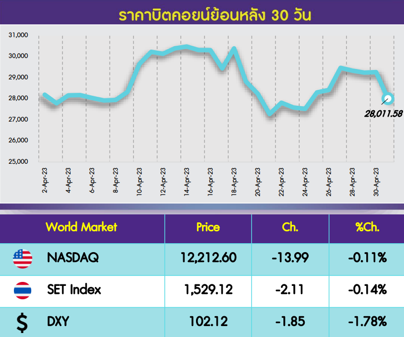 ตลาด Cryptocurrency มีการปรับลดลงจากเมื่อวันศุกร์ที่ผ่านมา โดยราคา Bitcoin (BTC) ปรับลง -4.5% อยู่ที่ US$28,012 และ Ethereum (ETH) ปรับลง -3.3% อยู่ที่ US$1,830 ส่วนดัชนี NASDAQ วานนี้ปรับลงไป -0.11% ปัจจัยกดดันจากความกังวลปัญหาภาคธนาคารของสหรัฐ แม้ JP Morgan เตรียมเข้าซื้อกิจการ First Republic Bank แต่นักลงทุนกังวลว่าวิกฤติการณ์นี้อาจกลับมาอีกครั้ง นอกจากนี้ยังจับตาการประชุม FOMC ในวันนี้และวันพรุ่งนี้ ซึ่งต้องติดตามว่าจะมีการส่งสัญญาณถึงทิศทางดอกเบี้ยหลังจากการประชุมครั้งนี้อย่างไร ด้าน Crypto Greed & Fear index ได้ปรับลงจากเมื่อวานนี้จาก 64 สู่ 55 โดยภาพรวมยังคงอยู่ในระดับ Greed |