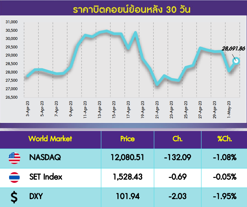 ตลาด Cryptocurrency วานนี้ฟื้นตัวขึ้น โดยราคา Bitcoin (BTC) ปรับขึ้น +2.1% อยู่ที่ US$28,692 และ Ethereum (ETH) ปรับขึ้นมาเช่นกัน +2.1% อยู่ที่ US$1,871 สวนทางกับดัชนี NASDAQ วานนี้ปรับลงไป -1.08% หลังสหรัฐรายงานตัวเลขตำแหน่งงานใหม่ (JOLTS) ออกมาต่ำกว่าคาดและต่ำสุดในรอบ 2 ปี บ่งชี้ภาวะชะลอตัวลงของตลาดแรงงาน ช่วยลดแรงกดดันที่ Fed จะยังเดินหน้าขึ้นดอกเบี้ย อย่างไรก็ตาม อาจมีความผันผวนที่มากขึ้นจากการประชุม FOMC ในวันนี้ ซึ่งต้องติดตามความเห็นของคณะกรรมการฯ ต่อแนวโน้มดอกเบี้ยในช่วงที่เหลือของปีนี้ ด้าน Crypto Greed & Fear index ได้ปรับขึ้นจากเมื่อวานนี้จาก 55 สู่ 64 โดยภาพรวมยังคงอยู่ในระดับ Greed