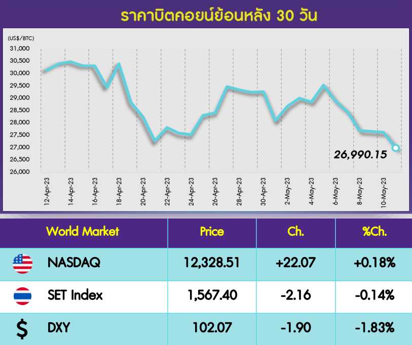 ตลาด Cryptocurrency ในช่วง 1 วันที่ผ่านมาเป็นภาพของการปรับตัวลดลง โดยราคา Bitcoin (BTC) ปรับตัวลดลง 2.3% อยู่ที่ US$26,990 และ Ethereum (ETH) ลดลง 2.6% อยู่ที่ US$1,795 โดยภาพรวมการลงทุนได้รับแรงกดดันจากประเด็นเรื่อง Regulation ของประเทศสหรัฐอีกครั้ง โดยเมื่อคืนที่ผ่านมาทาง U.S. Chamber of Commerce ได้มีการออกมาโจมตี SEC ของประเทศสหรัฐว่า ควรจะสร้างความชัดเจนให้กับกฎเกณฑ์เกี่ยวกับ Digital assets และถือว่าการกระทำที่ผ่านมาของ SEC เป็นการกระทำที่ไม่ชอบด้วยกฎหมาย ดัชดี NASDAQ ปรับตัวเพิ่มขึ้น 0.2% Crypto Greed & Fear index ปรับตัวลดลงตามภาพตลาดเช่นกันอยู่ที่ 49 จาก 52 โดยยังอยู่ในระดับ Neutral |