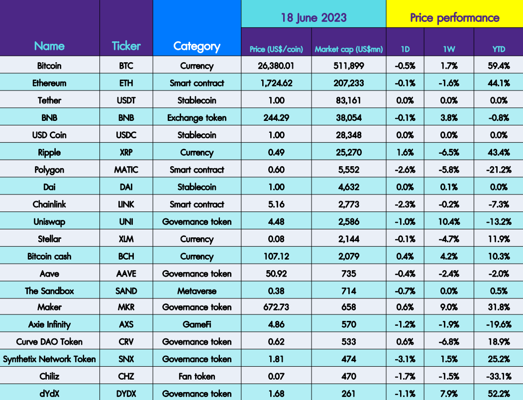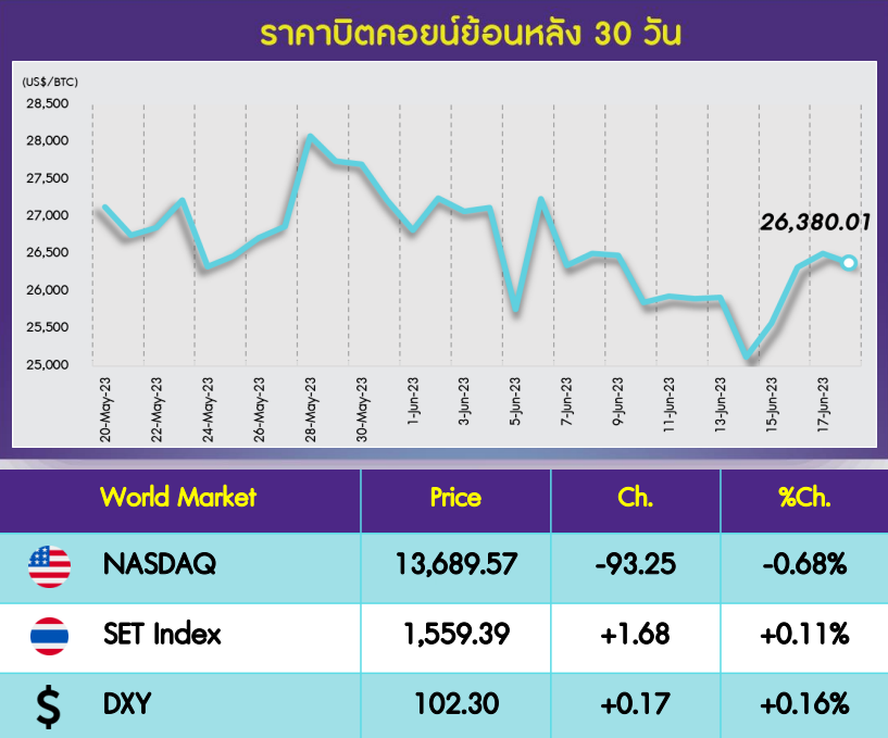 ตลาด Cryptocurrency ในช่วงวันหยุดที่ผ่านมาปรับตัวเพิ่มขึ้น 3.4% อยู่ที่ US$26,380 และ Ethereum (ETH) ปรับตัวเพิ่มขึ้น 3.7% อยู่ที่ US$1,725 โดยตลาดได้รับแรงหนุนจากประเด็นที่ทาง BlackRock (บริษัทจัดการกองทุนระดับโลก) ได้ยื่นขอทาง SEC ในการเสนอขาย Spot Bitcoin ETF ประกอบกับนักลงทุนให้ความคาดหวังว่ารอบนี้มีโอกาสที่จะผ่าน และอาจจะนำไปสู่การเข้ามาลงทุนเพิ่มเติมของนักลงทุนรายย่อยและสถาบันได้ ประกอบกับไม่ได้มีประเด็นอะไรใหม่ๆเข้ามาในเรื่องของ Regulation ของประเทศสหรัฐที่เป็นประเด็นก่อนหน้านี้ ดัชนี NASDAQ ปิดลง 0.7% เมื่อวันศุกร์ที่ผ่านมา Crypto Greed & Fear index ทรงตัวอยู่ที่ 47 ยังคงอยู่ในระดับ Neutral |