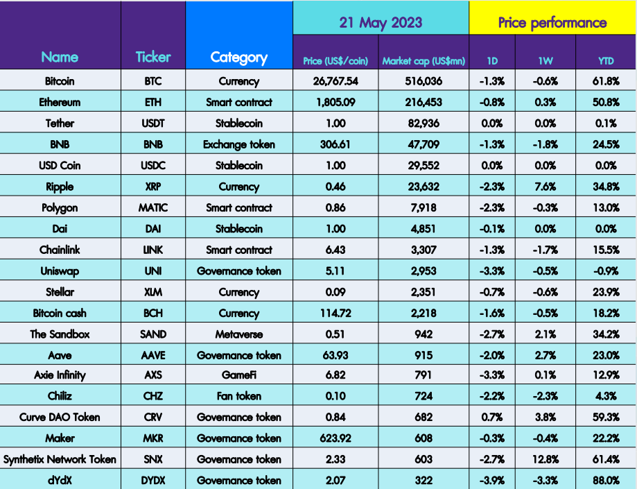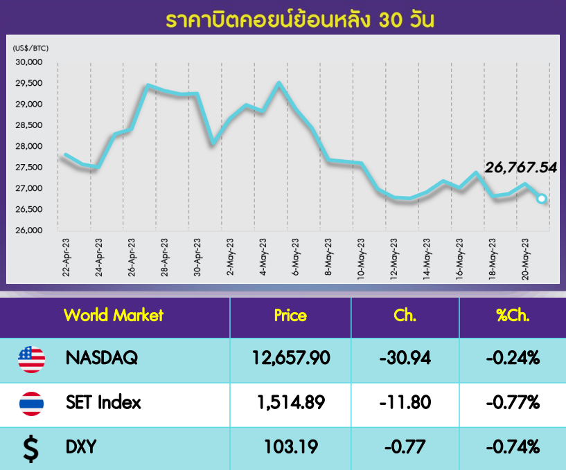 ตลาด Cryptocurrency ในช่วงวันหยุดที่ผ่านมายังคงแกว่งตัวในกรอบแคบแบบผสมผสานอย่างต่อเนื่อง โดยราคา Bitcoin (BTC) ปรับตัวลดลง 0.2% อยู่ที่ US$26,769 และ Ethereum (ETH) เพิ่มขึ้น 0.3% อยู่ที่ 1,805 โดยเมื่อวันศุกร์ที่ผ่านมาถ้อยแถลงของคุณ Powell ก็ยังถือว่าไม่ได้ส่งสัญญาณอะไรใหม่ถึงแม้ว่าจะดูเหมือนมีโอกาสที่จะหยุดการขึ้นดอกเบี้ยแล้วก็ตาม แต่สิ่งที่สำคัญที่สุดคือแนวโน้มของการลดดอกเบี้ยซึ่งยังไม่เห็นภาพนั้น ณ ตอนนี้ ดัชนี NASDAQ ปรับตัวลดลง 0.2% ในวันศุกร์ที่ผ่านมา Crypto Greed & Fear index ปรับตัวเพิ่มขึ้นเล็กน้อยอยู่ที่ 49 จาก 48 แต่ภาพรวมยังคงอยู่ในระดับ Neutral |