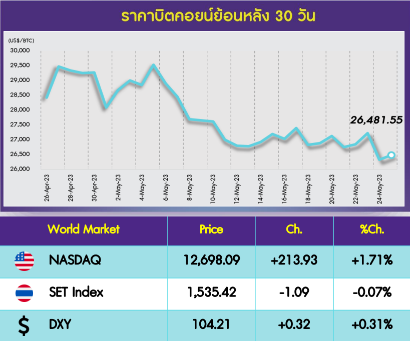 ตลาด Cryptocurrency ในช่วง 1 วันที่ผ่านมาฟื้นตัวได้เล็กน้อย โดยราคา Bitcoin (BTC) ปรับตัวเพิ่มขึ้น 0.6% อยู่ที่ US$26,482 และ Ethereum (ETH) เพิ่มขึ้น 0.3% อยู่ที่ US$1,806 โดยตลาดยังคงแกว่งตัวในกรอบแคบเพื่อรอดูปัจจัยใหม่ๆ โดยวันนี้สิ่งที่นักลงทุนต้องติดตามคือตัวเลข Core PCE ซึ่งถ้าออกมาดีกว่าคาดอาจจะสร้าง Sentiment เชิงบวกระยะสั้นได้ โดยตลาดคาดโต 0.3% MoM และ 4.6% YoY ดัชนี NASDAQ ปรับตัวเพิ่มขึ้น 1.7% โดย Crypto Greed & Fear index แกว่งตัวในกรอบแคบเช่นกัน อยู่ที่ 49 จาก 51 สอดคล้องกับภาพตลาดโดยรวม โดยยังคงอยู่ในระดับ Neutral |