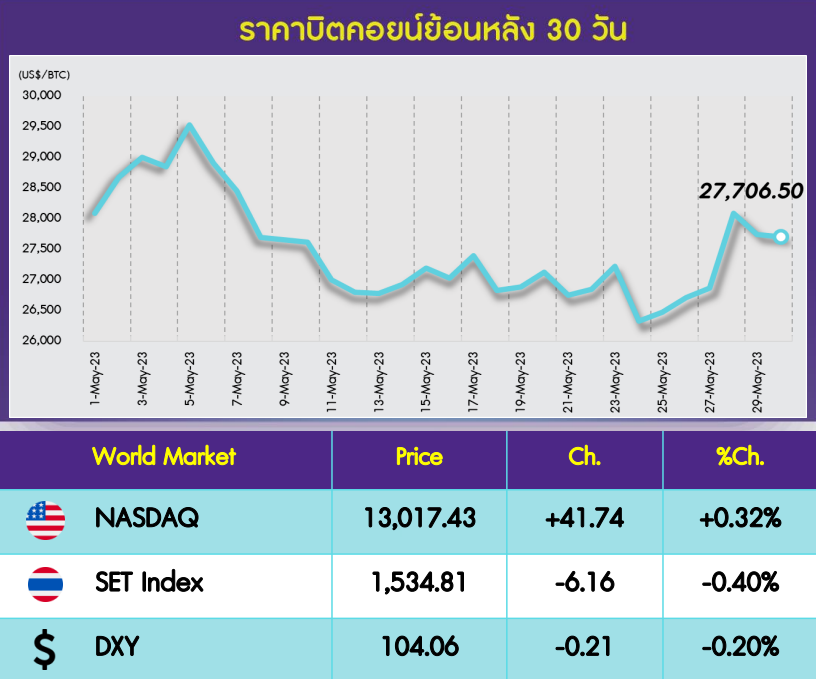 ตลาด Cryptocurrency ในช่วง 1 วันที่ผ่านมาปรับตัวในกรอบแคบแบบผสมผสาน โดยราคา Bitcoin (BTC) ลดลง 0.1% อยู่ที่ US$27,707 และ Ethereum (ETH) เพิ่มขึ้น 0.4% อยู่ที่ US$1,902 โดยนักลงทุนยังคงรอดูประเด็นเรื่อง Debt ceiling ของประเทศสหรัฐ แต่ดูเหมือนตลาดจะมีประเด็นกดดันที่ต้องติดตามอันใหม่เข้ามาคือการประชุม Fed เดือนมิถุนายนที่ตอนนี้นักลงทุนเริ่มกลับมามองว่ามีโอกาสที่ Fed จะขึ้นดอกเบี้ยเพิ่มอีก 25bps จากก่อนหน้านี้คาดว่าน่าจะคงดอกเบี้ย ดัชนี NASDAQ ปรับตัวเพิ่มขึ้น 0.3% Crypto Greed & fear index ทรงตัวที่ระดับ 51 สอดคล้างกับภาพตลาดที่แกว่งในกรอบแคบโดยยังคงอยู่ในระดับ Neutral |