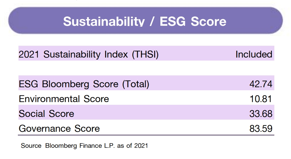 การจัดทำข้อมูลด้านสิ่งแวดล้อม สังคมและการกำกับดูแลกิจการที่ดี (Environmental Social Governance หรือ ESG) เป็นการทำข้อมูลและเปิดเผยโดยบริษัท Bloomberg ซึ่งมีการทำข้อมูลด้านสิ่งแวดล้อม ด้านสังคม และด้านธรรมภิบาล อาทิเช่นข้อมูลการใช้พลังงานที่สะท้อนต้นทุน ความเสี่ยงในการพึ่งพาพลังงานของธุรกิจ ความเสี่ยงด้านการทำงานที่อาจจะเกิดจากอุบัติเหตุ รวมถึงสัดส่วนของคณะกรรมการบริหาร ตั้งแต่ปี 2010 และขึ้นอยู่กับการเปิดเผยข้อมูลของแต่ละบริษัท