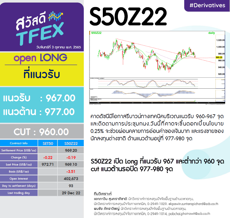 คาดดัชนีมีโอกาสรีบาวน์ทางเทคนิคบริเวณแนวรับ 960-967 จุด และติดตามการประชุมกนง.วันนี้ที่คาดจะขึ้นดอกเบี้ยนโยบาย 0.25% จะช่วยผ่อนคลายการอ่อนค่าของเงินบาท และแรงขายของนักลงทุนต่างชาติ ด้านแนวต้านอยู่ที่ 977-980 จุด